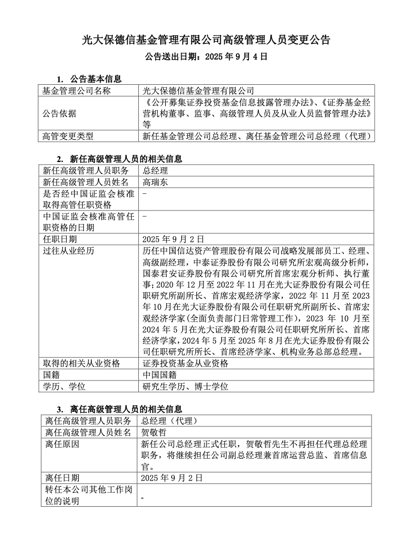 9月4日,光大保德信基金发布公告称,自9月2日起,任命高瑞东为公司总经理,贺敬哲不再担任代理总经理职务,但将继续担任公司副总经理兼首席运营总监、首席信息官。