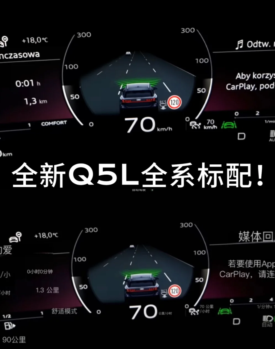 配置方面,全新 Q5L 也藏了不少惊喜。首先是全系标配的实用功能,从曝光的仪表界面能看到,车辆支持 Apple CarPlay,连接后能直接在仪表上显示导航,不用低头看手机,开车更安全;还有舒适模式、自动驻车等基础配置,大概率也会是全系标配,不用再为了实用功能多花钱选装。其次是用户最关心的智驾 —— 有网友确认 “配的是华为智驾”,要知道华为智驾在国内的口碑一直不错,不管是高速领航还是市区拥堵跟车,都能提供稳定的辅助,对新手或经常跑长途的用户来说,这绝对是加分项。